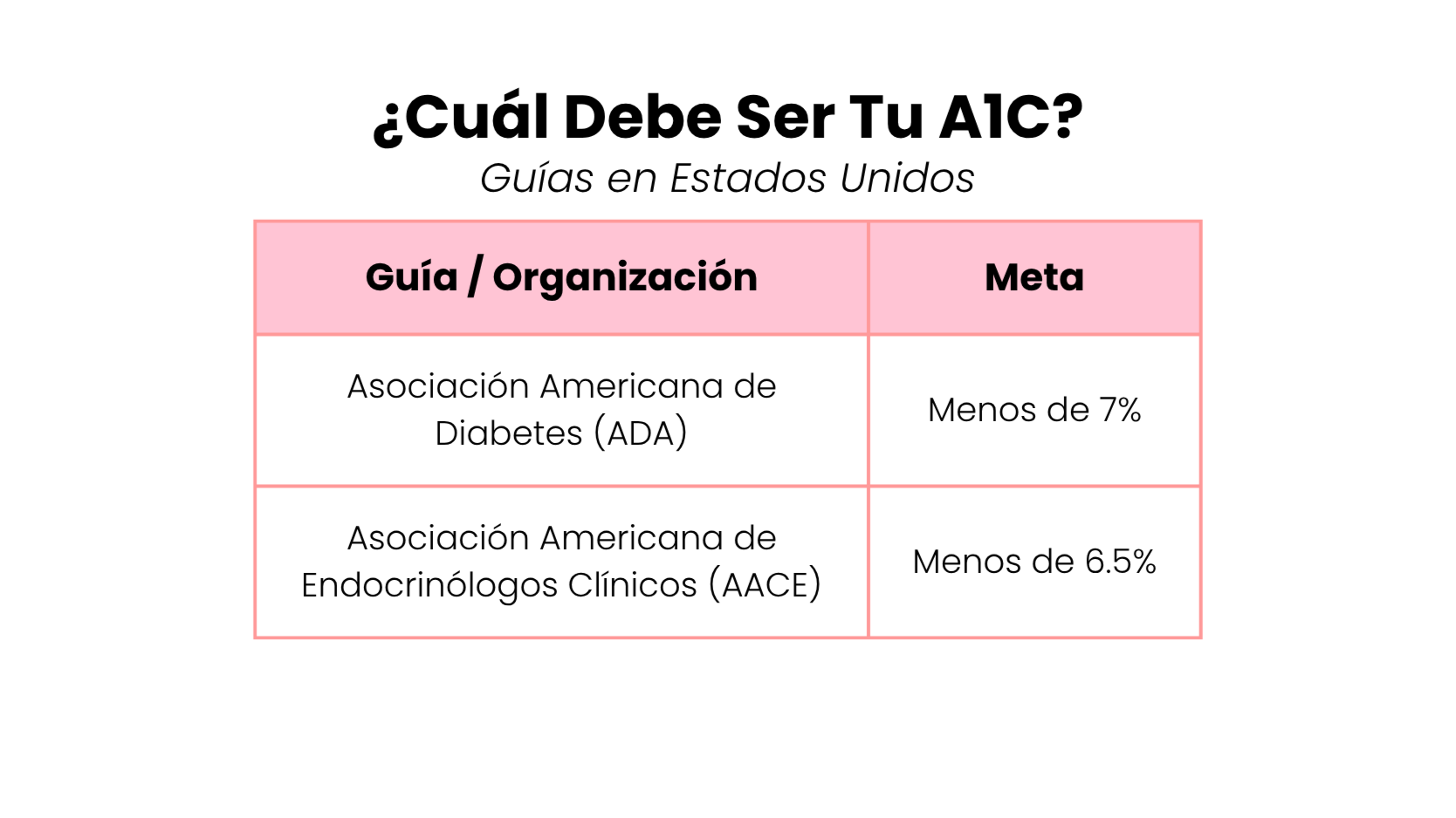 Estas son recomendaciones generales. Tu meta de A1C puede ser diferente según tu edad, salud y tratamiento.